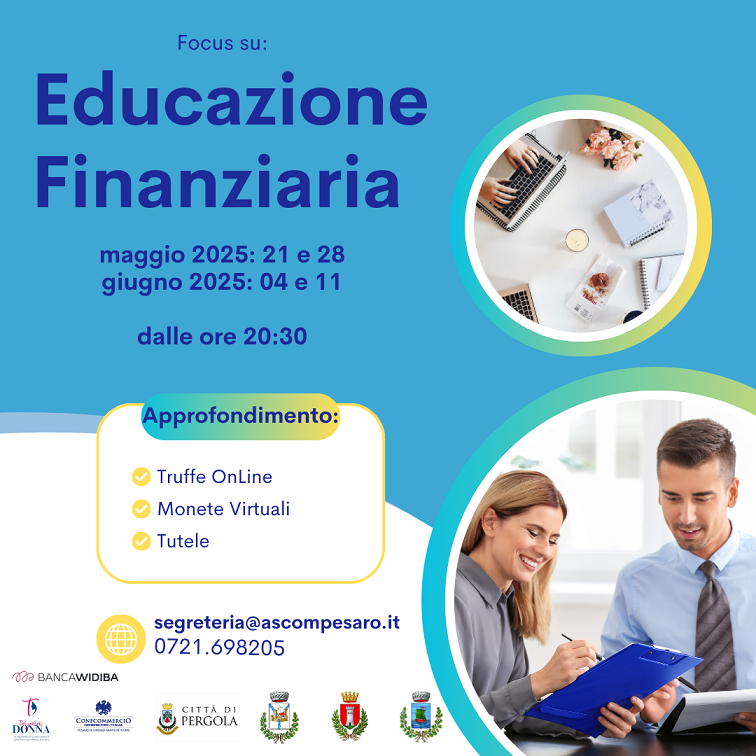 Terziario Donna con Confcommercio Marche Nord e la collaborazione di Banca Widiba e delle amministrazioni comunali coinvolte organizza un corso di ‘Educazione finanziaria’ per approfondire tematiche di strettissima attualità, in particolare le truffe online e le monete virtuali.