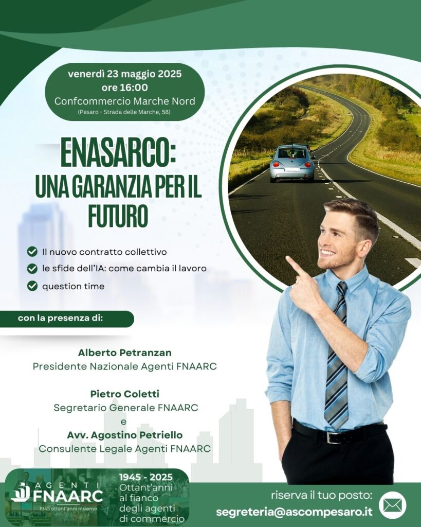 “Enasarco: una garanzia per il futuro” è il titolo dell’interessante incontro in programma venerdì 23 maggio alle ore 16, nella sede di Confcommercio Marche Nord a Pesaro. L’iniziativa è organizzata da FNAARC (Federazione Nazionale Associazione Agenti e Rappresentati di Commercio) ed è dedicata agli agenti e rappresentanti della Provincia di Pesaro e Urbino.