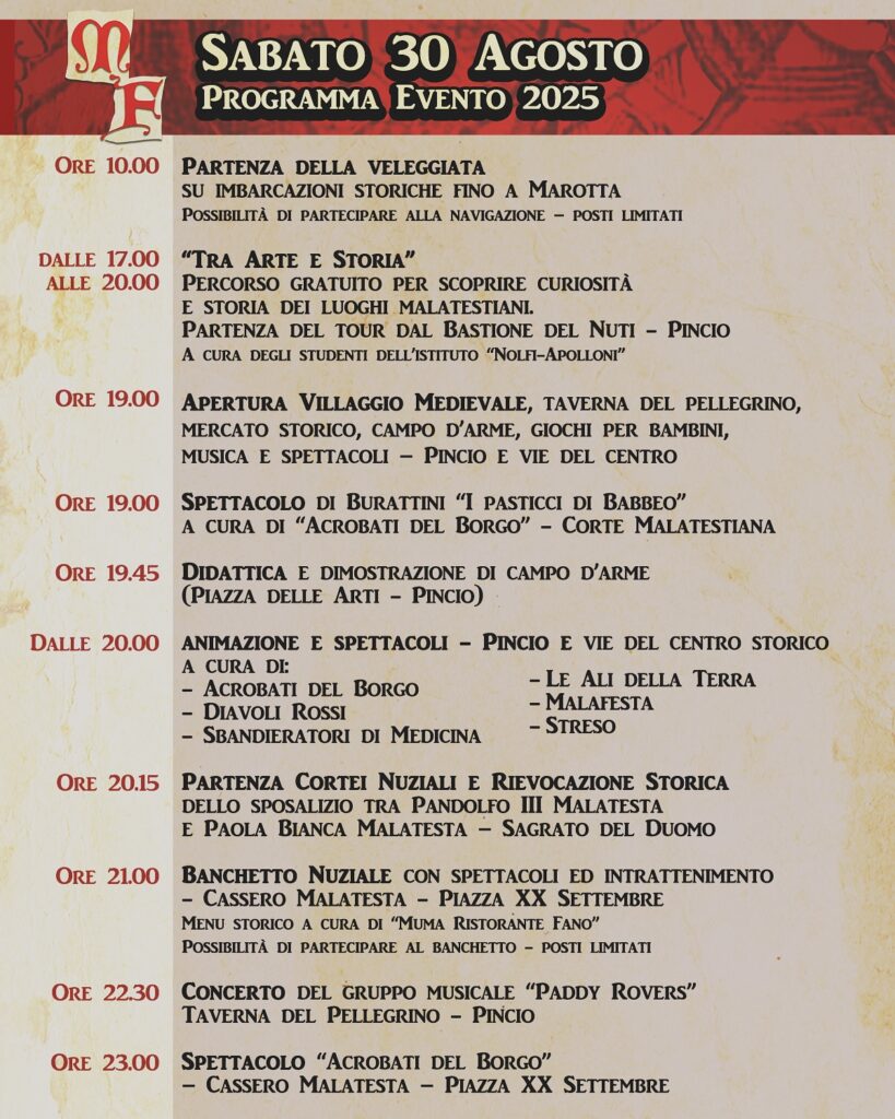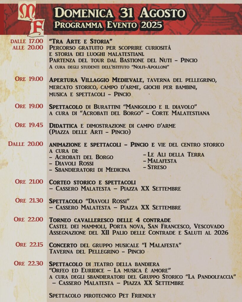 L’evento comprende spazi di ricostruzione storica con mercatini, spettacoli come il Matrimonio di Pandolfo Malatesta e tante attività e spazi dedicati anche ai bambini.