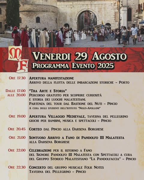 Armigeri, sbandieratori, musici, nobili dame e prodi cavalieri, insieme a falconieri e artisti di strada, animeranno il borgo con scene mirabili, in quell’atmosfera unica che solo ‘I Malatesta a Fano’ sanno donare.